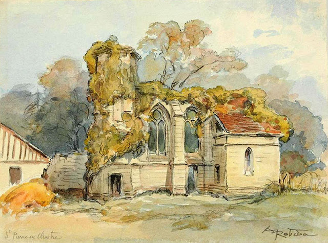 n°221 - " Vue de l'église de Noyon" aquarelle et fusain. (19,5x20cm)